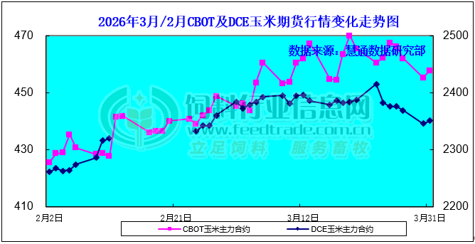 本月CBOT期貨價格震蕩走高,截止3月31日,5月合約價格比一月前上漲19美分/蒲式耳,報收457.75美分/蒲式耳;本月大連玉米期貨偏弱整理,截至3月31日大連玉米2605合約收于2351元/噸,較上月末下跌9元/噸。