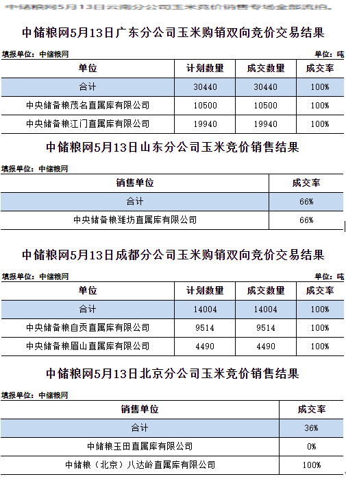 中儲糧網2025年5月13日玉米競價交易結果
