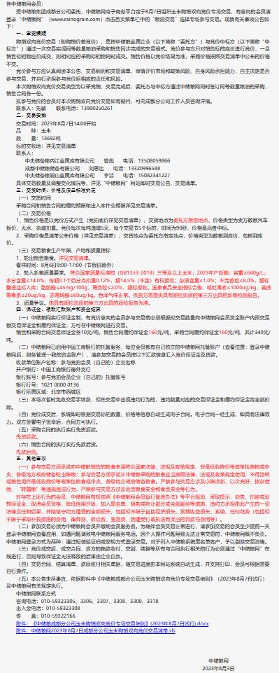 8月7日中儲糧成都分公司玉米購銷雙向競價交易專場公告