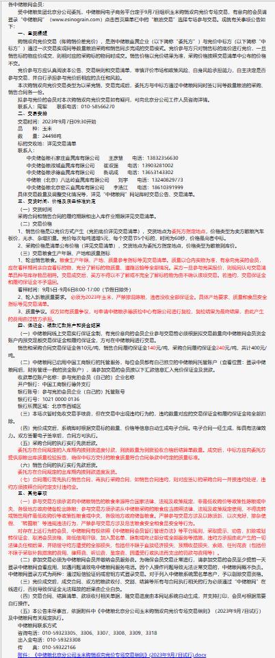 9月7日中儲糧北京分公司玉米購銷雙向競價交易專場公告