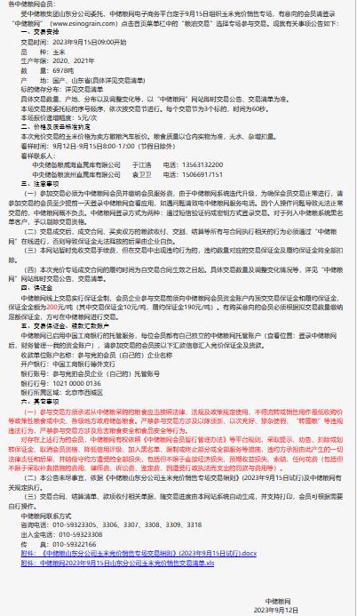 9月15日中儲糧山東公司玉米競價銷售專場公告