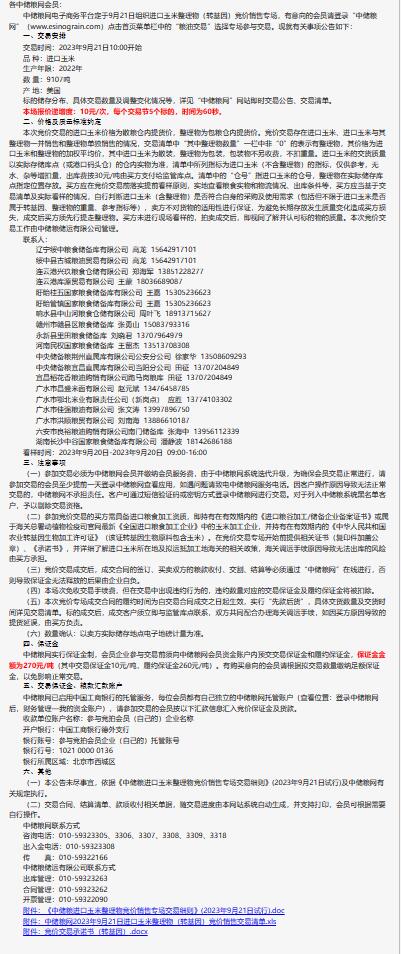 9月21日中儲糧進口玉米及整理物(轉基因)競價銷售專場公告
