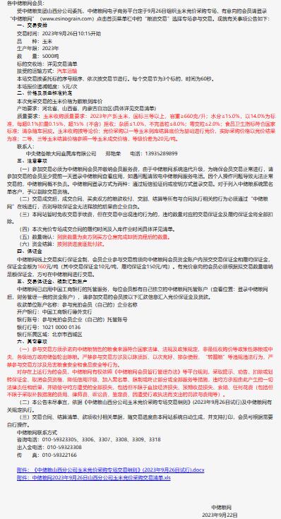 9月26日中儲糧山西分公司玉米競價采購專場公告