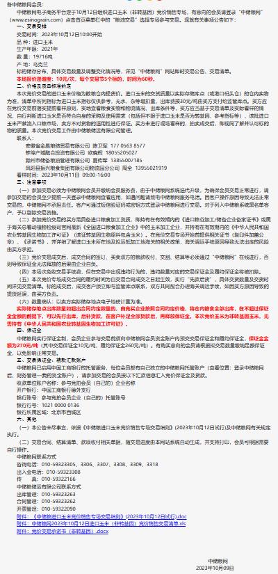 10月12日中儲糧進口玉米及整理物(非轉基因)競價銷售專場公告