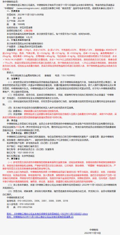 2023年11月13日中儲糧云南分公司玉米競價采購專場公告