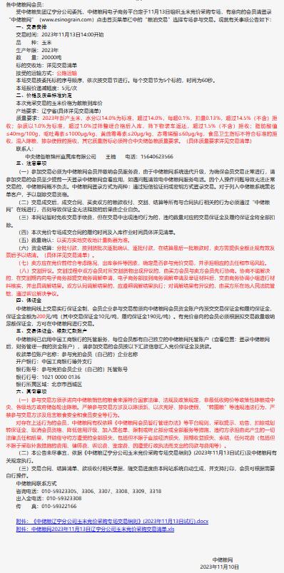 2023年11月13日中儲糧遼寧分公司玉米競價采購專場公告