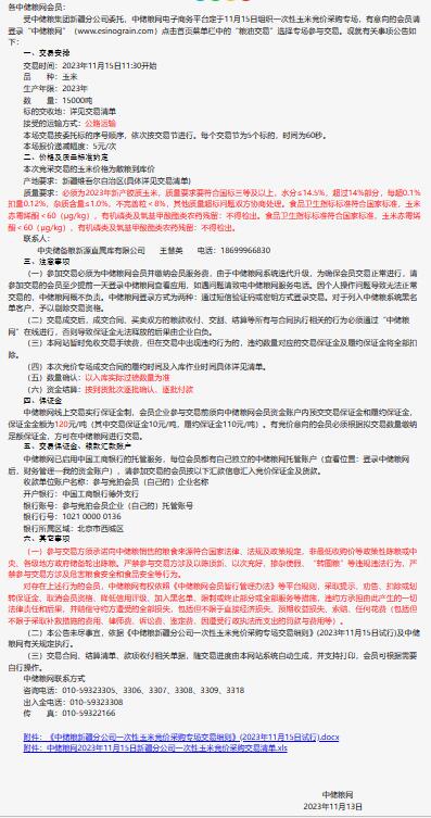 11月15日中儲糧新疆分公司一次性玉米競價采購專場公告