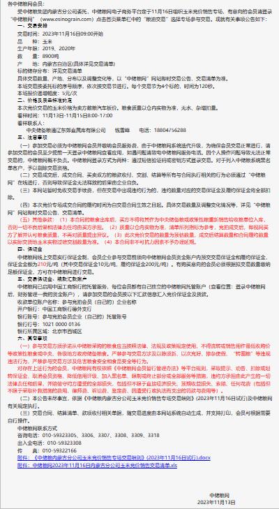 2023年11月16日中儲糧內蒙古分公司玉米競價銷售專場公告