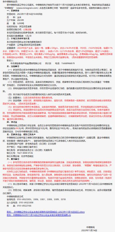 2023年11月16日中儲糧遼寧分公司玉米競價采購專場公告