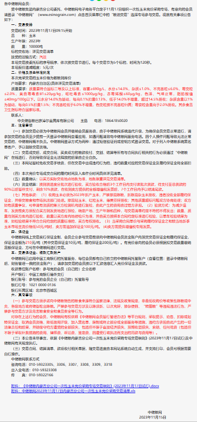 11月17日中儲糧內蒙古分公司一次性玉米競價采購專場公告