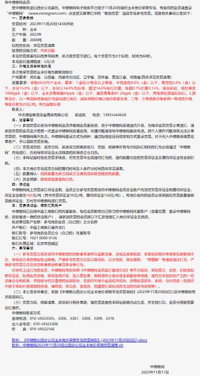 2023年11月20日中儲糧山西分公司玉米競價采購專場公告