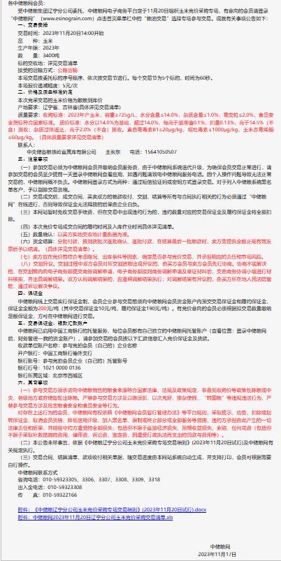 2023年11月20日中儲糧遼寧分公司玉米競價采購專場公告