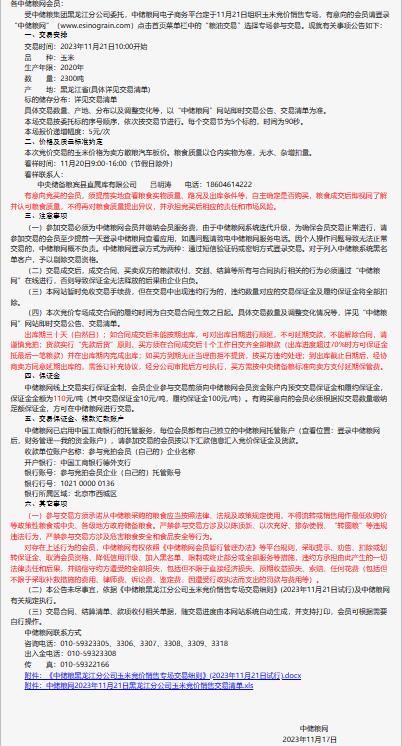 2023年11月21日中儲糧黑龍江分公司玉米競價銷售專場公告