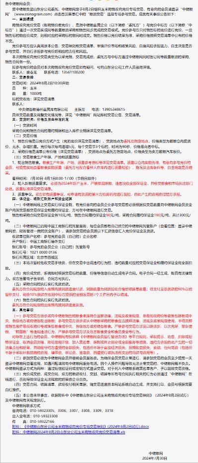 2024年8月2日中儲糧山東分公司玉米購銷雙向競價交易專場公告