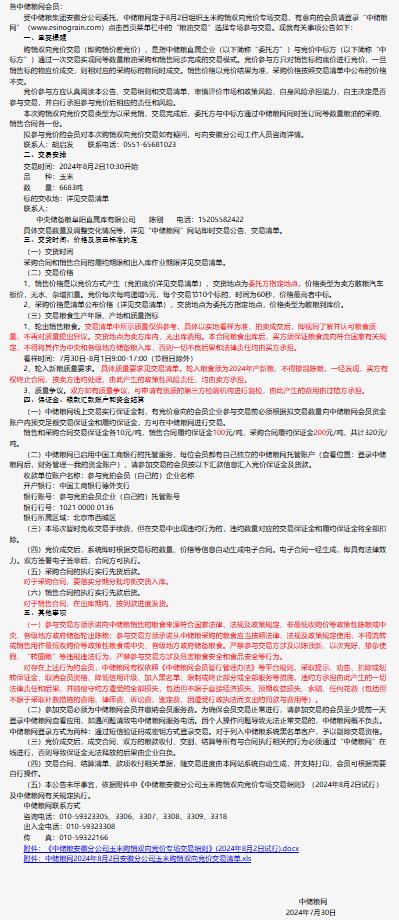 2024年8月2日中儲糧安徽分公司玉米購銷雙向競價交易專場公告