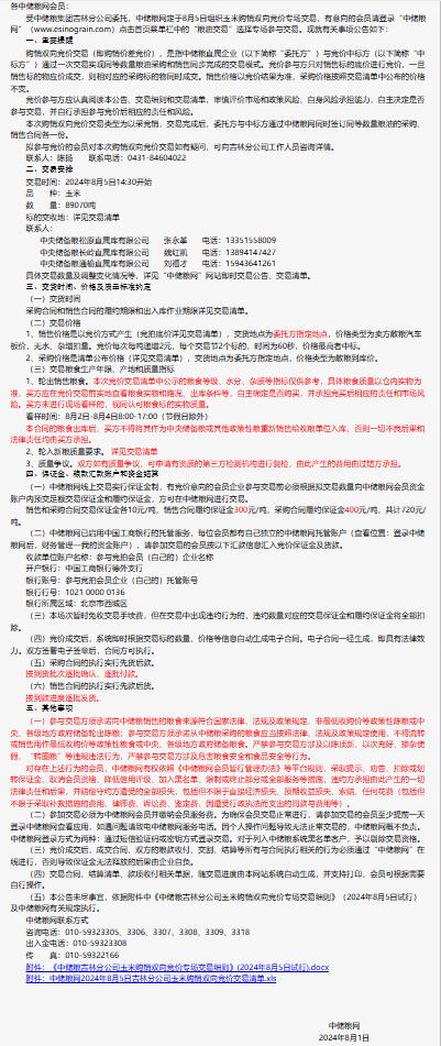 2024年8月5日中儲糧吉林分公司玉米購銷雙向競價交易專場公告