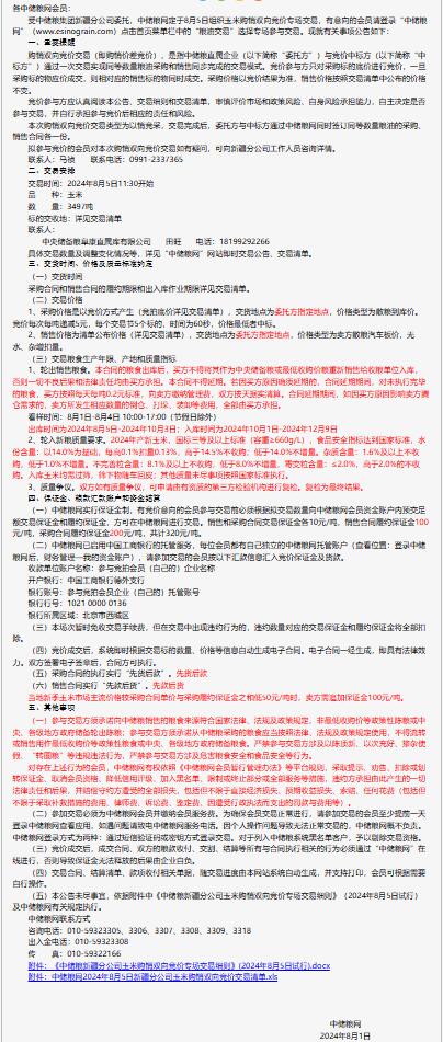 2024年8月5日中儲糧新疆分公司玉米購銷雙向競價交易專場公告
