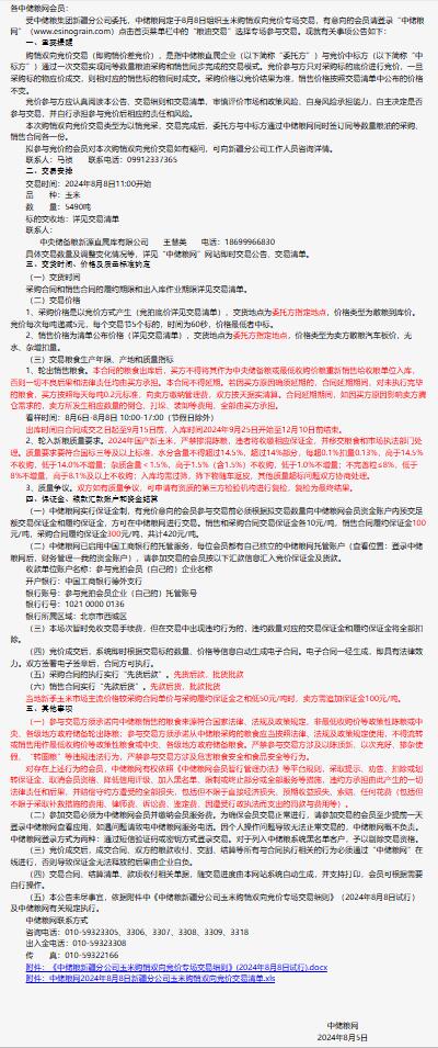 2024年8月8日中儲糧新疆分公司玉米購銷雙向競價交易專場公告