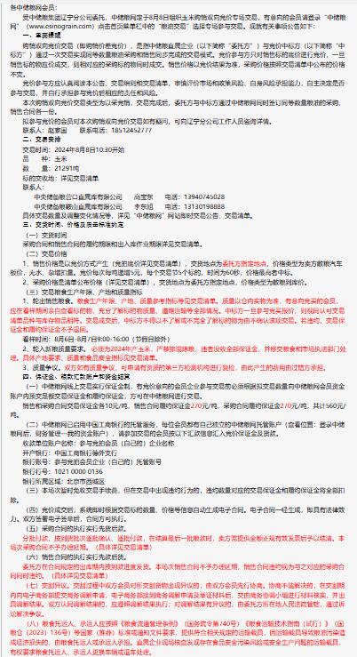 2024年8月8日中儲糧遼寧分公司玉米購銷雙向競價交易專場公告