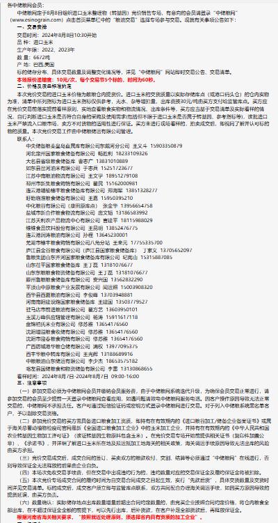 2024年8月8日中儲糧進口玉米及整理物(轉基因)競價銷售專場公告