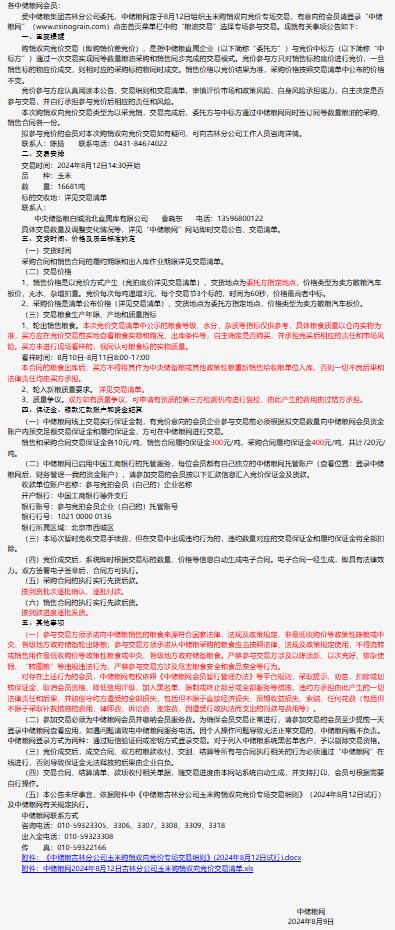 2024年8月12日中儲糧吉林分公司玉米購銷雙向競價交易專場公告