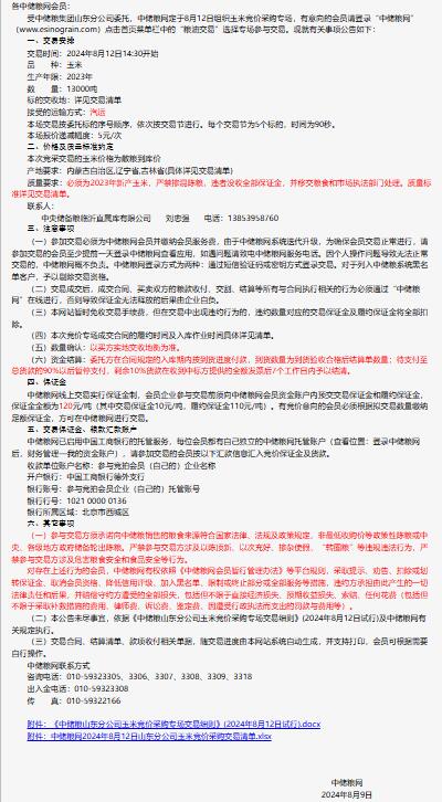 2024年8月12日中儲糧山東分公司玉米競價采購專場公告