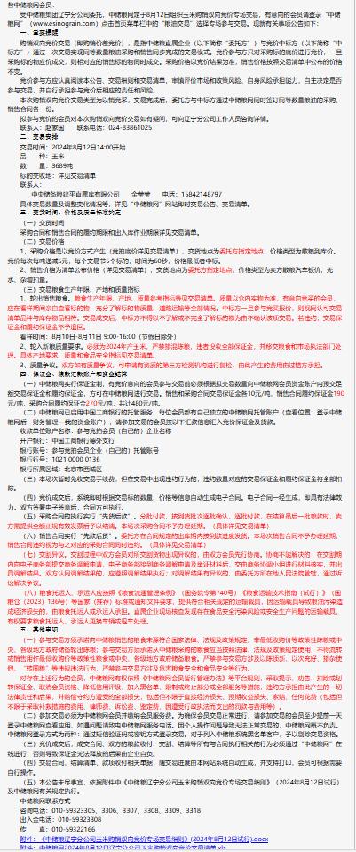 2024年8月12日中儲糧遼寧分公司玉米購銷雙向競價交易專場公告