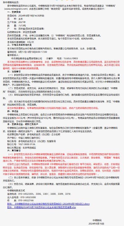 2024年8月19日中儲糧吉林分公司玉米競價銷售專場公告