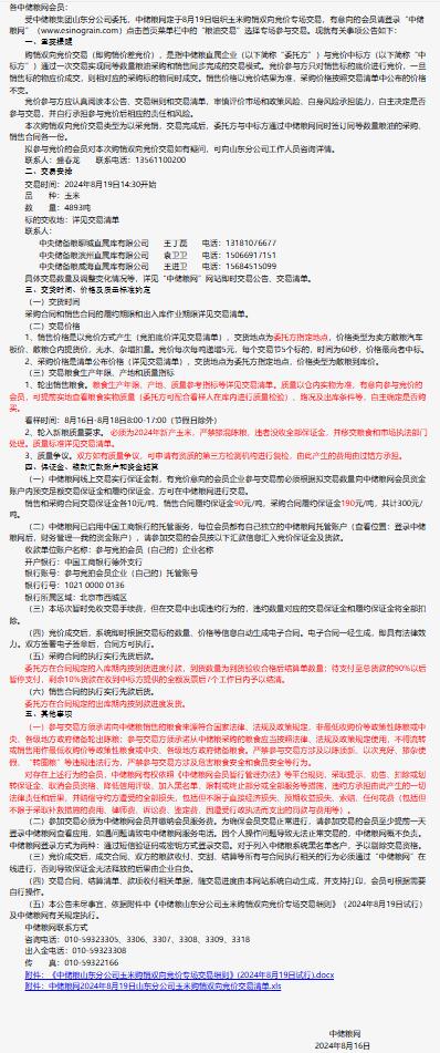 2024年8月19日中儲糧山東分公司玉米購銷雙向競價交易專場公告