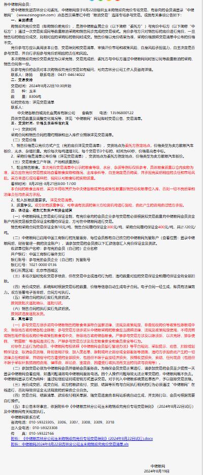 2024年8月22日中儲糧吉林分公司玉米購銷雙向競價交易專場公告