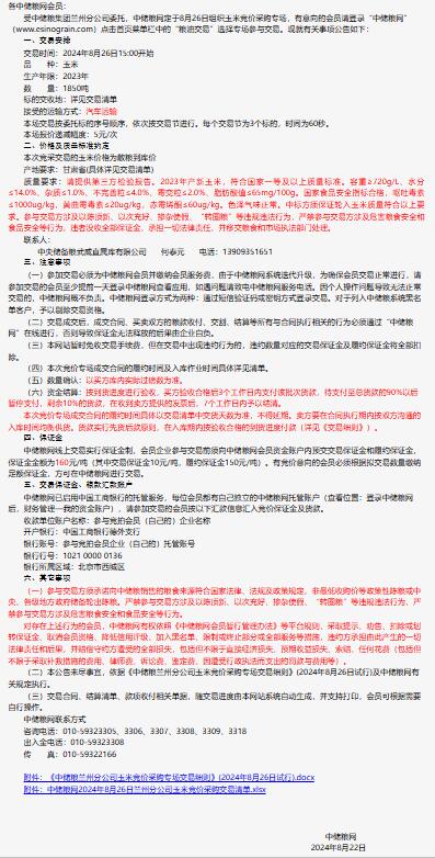 2024年8月26日中儲糧蘭州分公司玉米競價采購專場公告