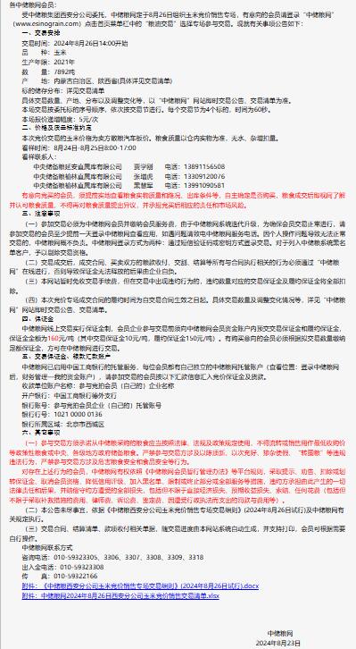 2024年8月26日中儲糧西安分公司玉米競價銷售專場公告