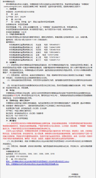 2024年8月26日中儲糧山東分公司玉米競價銷售專場公告
