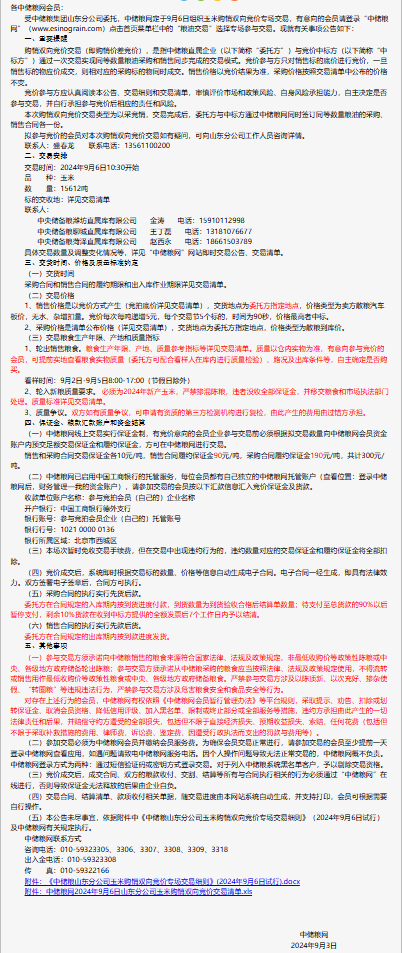 2024年9月6日中儲糧山東分公司玉米購銷雙向競價交易專場公告