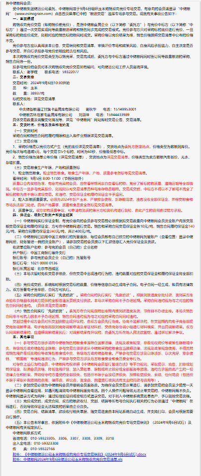 2024年9月6日中儲糧儲運公司玉米購銷雙向競價交易專場公告