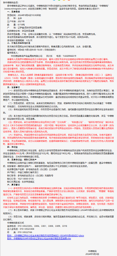 2024年9月6日中儲糧遼寧分公司玉米競價銷售專場公告