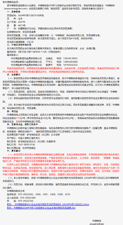 2024年9月12日中儲糧西安分公司玉米競價銷售專場公告