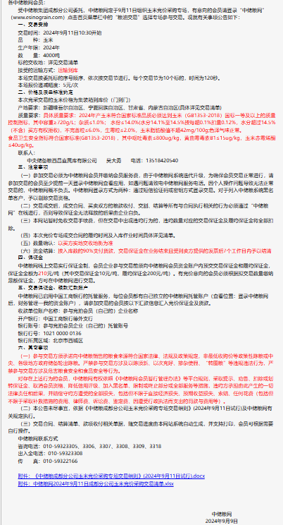 2024年9月11日中儲糧成都分公司玉米競價采購專場公告