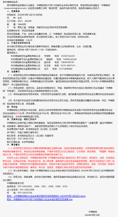 2024年9月12日中儲糧河南分公司玉米競價銷售專場公告