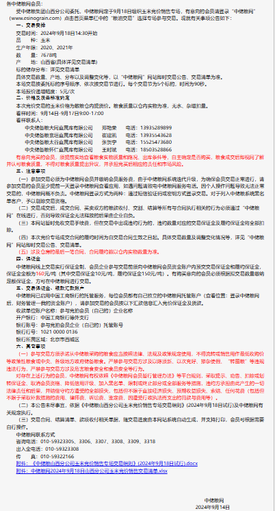 2024年9月18日中儲糧山西分公司玉米競價銷售專場公告