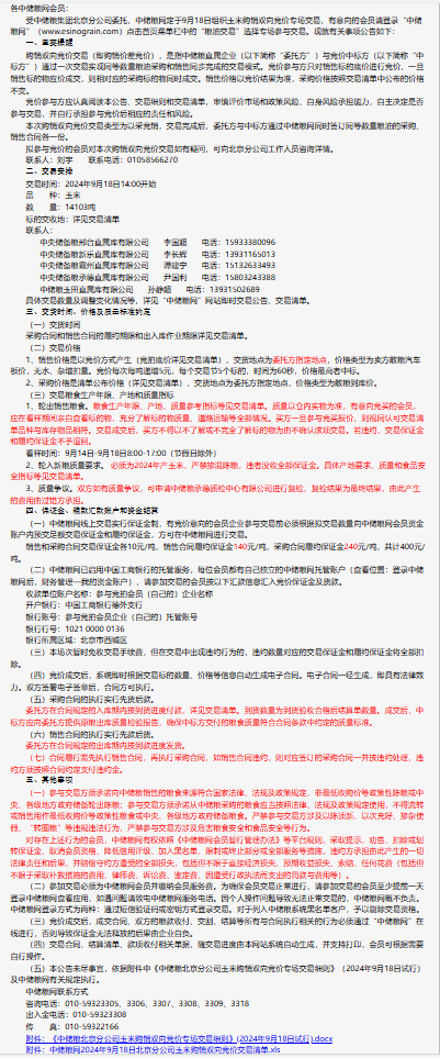 2024年9月18日中儲糧北京分公司玉米購銷雙向競價交易專場公告
