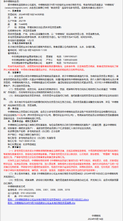 2024年9月18日中儲糧西安分公司玉米競價銷售專場公告
