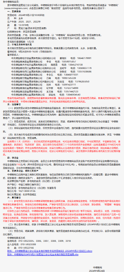 2024年9月27日中儲糧黑龍江分公司玉米競價銷售專場公告