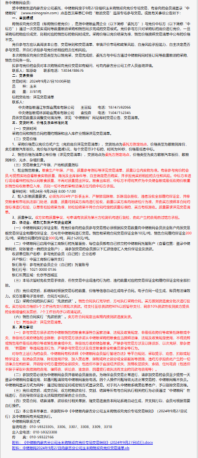 2024年9月27日中儲糧內蒙古分公司玉米購銷雙向競價交易專場公告