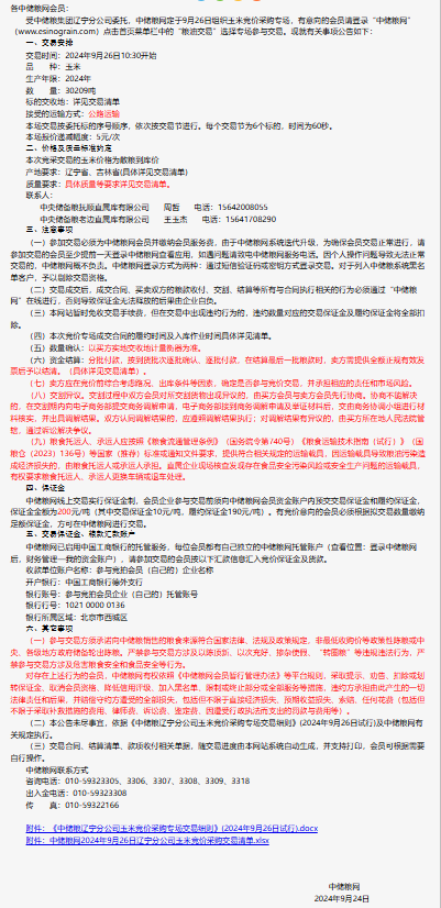 2024年9月26日中儲糧遼寧分公司玉米競價采購專場公告