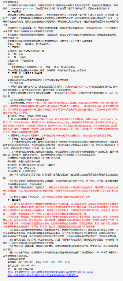 2024年9月29日中儲糧蘭州分公司玉米購銷雙向競價交易專場公告