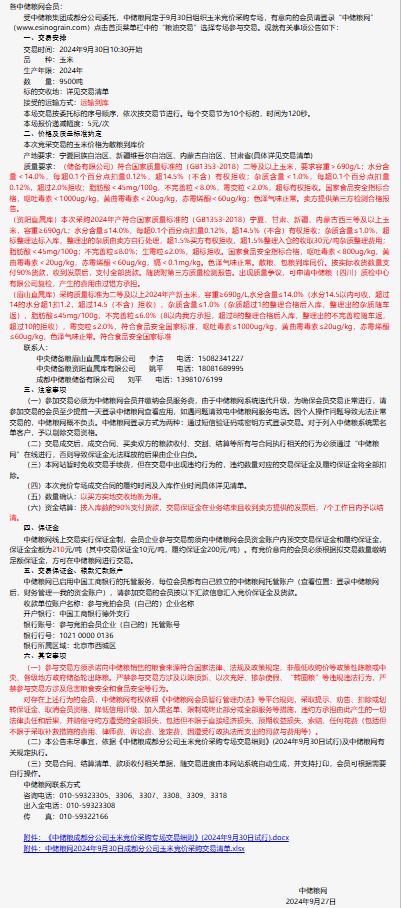 2024年9月30日中儲糧成都分公司玉米競價采購專場公告
