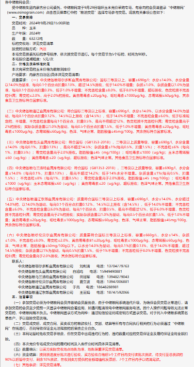 2024年9月29日中儲糧內蒙古分公司玉米競價采購專場公告