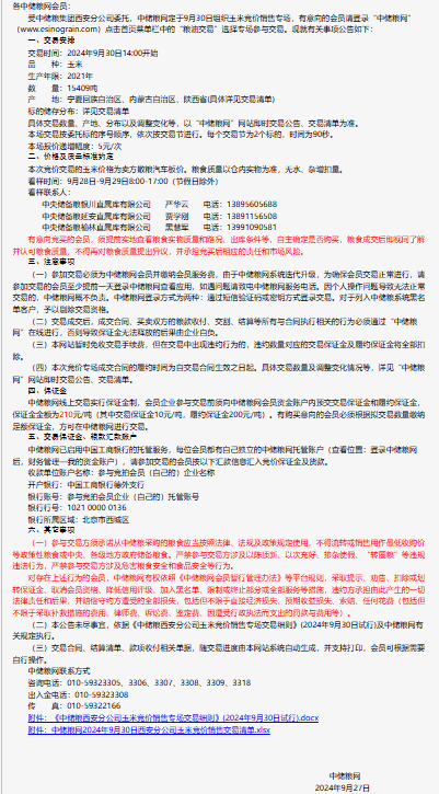 2024年9月30日中儲糧西安分公司玉米競價銷售專場公告