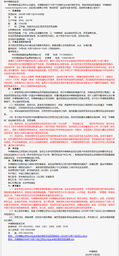 2024年10月11日中儲糧遼寧分公司玉米競價銷售專場公告